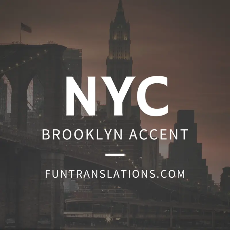Convert from English to Brooklyn Accent. Brooklyn accent is a regional dialect of the English language spoken by many people in New York City , Brooklyn and much of its surrounding metropolitan area.