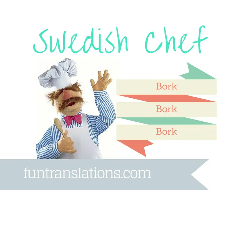 Convert from English to Swedish chef Speak. The Swedish Chef is a Muppet character that appeared on The Muppet Show. The Swedish Chef does not speak any known language, but his nonsense words are so widley interpreted as Swedish-sounding. So try converting and see what our chef says...bork, bork, bork!